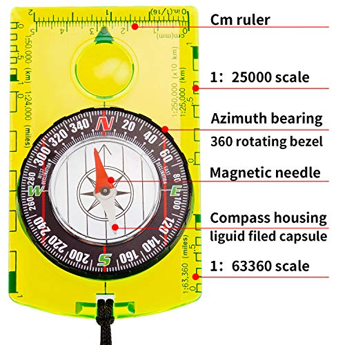 360 degree rotating bezel: acrylic baseplate compass with azimuth bearing and 360 degree rotating bezel, the plastic base is thick and durable, pointing to the magnetic north and the numbers on the bezel are easy to read