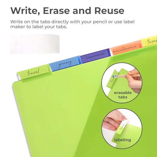 Our dividers for 3 ring binder are what you need to store, organize and label important documents, schoolwork, projects or files more efficiently! Using a color-coded system and special tabs for labeling, you can store your files and documents in categories for easy identification and efficient organization! Made with durable plastic and heat-press sealed edges, our binder dividers with tabs will last for years, keeping your documents safe and protected against damage. Use them for schoolwork, office projects, or recipes and impress your family and colleagues with your organizational skills!