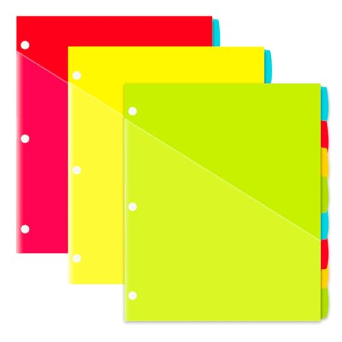 Premium Material: Our 8- tab dividers with pockets are made of high-quality PP material , providing an exceptional combination of softness and durability for daily use. With their wear-resistant construction, the pocket dividers offer long-lasting performance while maintaining the highest quality standards. Featuring 3 pre-punched holes, these dividers effortlessly fit into 3-ring binders, ensuring seamless organization and easy access to your documents.