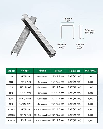 [What’s in the Box] Contains 5,000 pieces 20 gauge 1/2″ (12.3 mm) crown 3/8″ (10 mm) length stainless steel upholstery staples (50 series). Please note that these 50 series staples are different from Type 140 and T50 staples and they are not compatible with T50 staplers. (We have extra tape on the outside of the package to reduce the possibility of it falling apart in transit.)[Stainless Steel Staples] Made from stainless steel, these staples have better resistance to rust and corrosion than Galvanized staples. If you need to use them outdoors, we recommend using stainless steel staples, but please note that they are not suitable for boating or marine environments.