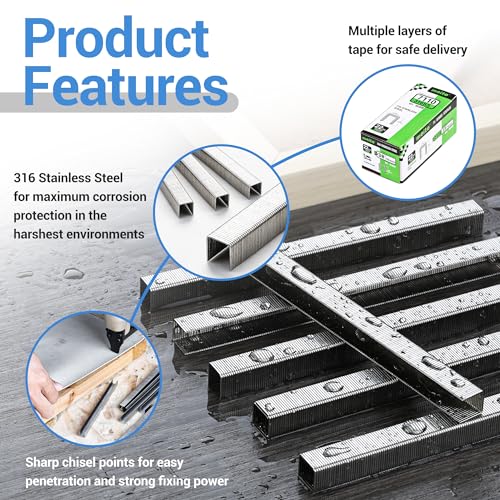 [Packages Include] Contains 10,000 counts 71 series 316 stainless steel 22 gauge 3/8″ crown 3/8″ length upholstery staples (Extra tape on the outside of the package to reduce the possibility of it falling apart in transit.)[316 Stainless Steel Staples] Made of high quality 316 stainless steel. Our 71 series upholstery staples are built to last, resistant to corrosion, and perfect for a wide range of projects. Can be used in marine or salt water environments.