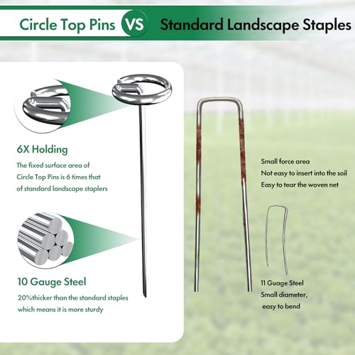 WILL NOT TERA THE FABRIC – Compared to standard landscape staples, this landscape stakes with circle top pins structure has a force area 6 times that of it, so the sub landscape fabric cannot be torn.