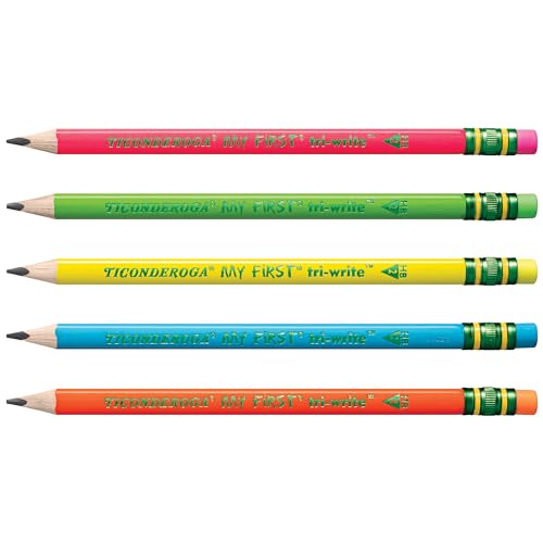 The Ticonderoga beginner pencil that teachers and parents love in bright neon colors! This triangular shaped, over sized pencil is ideal for children in the early stages of their writing development. The large size (13/32″) is easy for small hands to hold while the naturally ergonomic, triangular shape helps teach correct pencil grip. Matching neon latex-free erasers. The thick graphite #2 core delivers a broad smooth line. Premium wood harvested from responsibly managed sources provides smooth, even sharpening with minimal breakage. Teachers prefer Ticonderoga for its dependability and craftsmanship. Each pack includes 12 pencils.